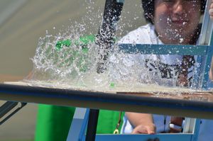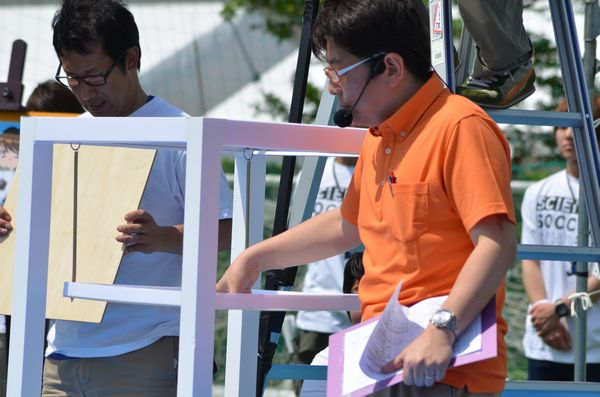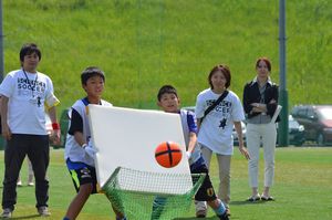 そして、科学実験の仕上げとして、参加した子どもたちは“力積”の原理を応用したゲームに挑戦しました。二人ひと組になって、マシンから放たれたボールを正方形の壁にあててから、かごに入れたら得点になるというものです。トラップのときは身体をひくのですが、このゲームでは手で壁を引くことによってボールの動きを止めるのです。ゲストの小倉さん、三浦さん、波戸さんも子どもたちと一緒になってゲームに参加して“力積”を体感していました。