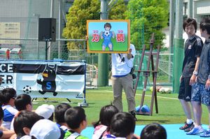 「ボールをとめる技術があるからこそ、正確なシュートを打つこともできるし、ドリブルでボールを運ぶこともできます」とゲストの小倉隆史さん、三浦淳寛さん、波戸康広さんがトラップを実演してくれました。3名の元日本代表選手によるパフォーマンスに会場もどよめきます。