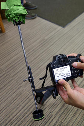 アンブレラブラケットとは、カメラやレンズに傘を装着するための器具です。「これも、プロの現場では傘の使用を禁止されていることが多いですが、邪魔にならないで使えるようなら、とても使い勝手がいいアイテムです。カメラは水が天敵ですし、何より両手が空くので、雨の中での撮影でも苦になりません」