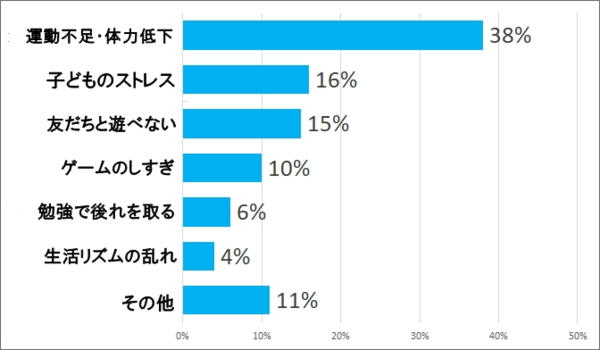 一番多かったのは「運動不足・体力低下」で38%でした。学校やサッカーの活動が停止になり、普段の活動量が減ったためエネルギーを発散することができないことや、お友達と遊べないことなどがストレスにつながっているようです。