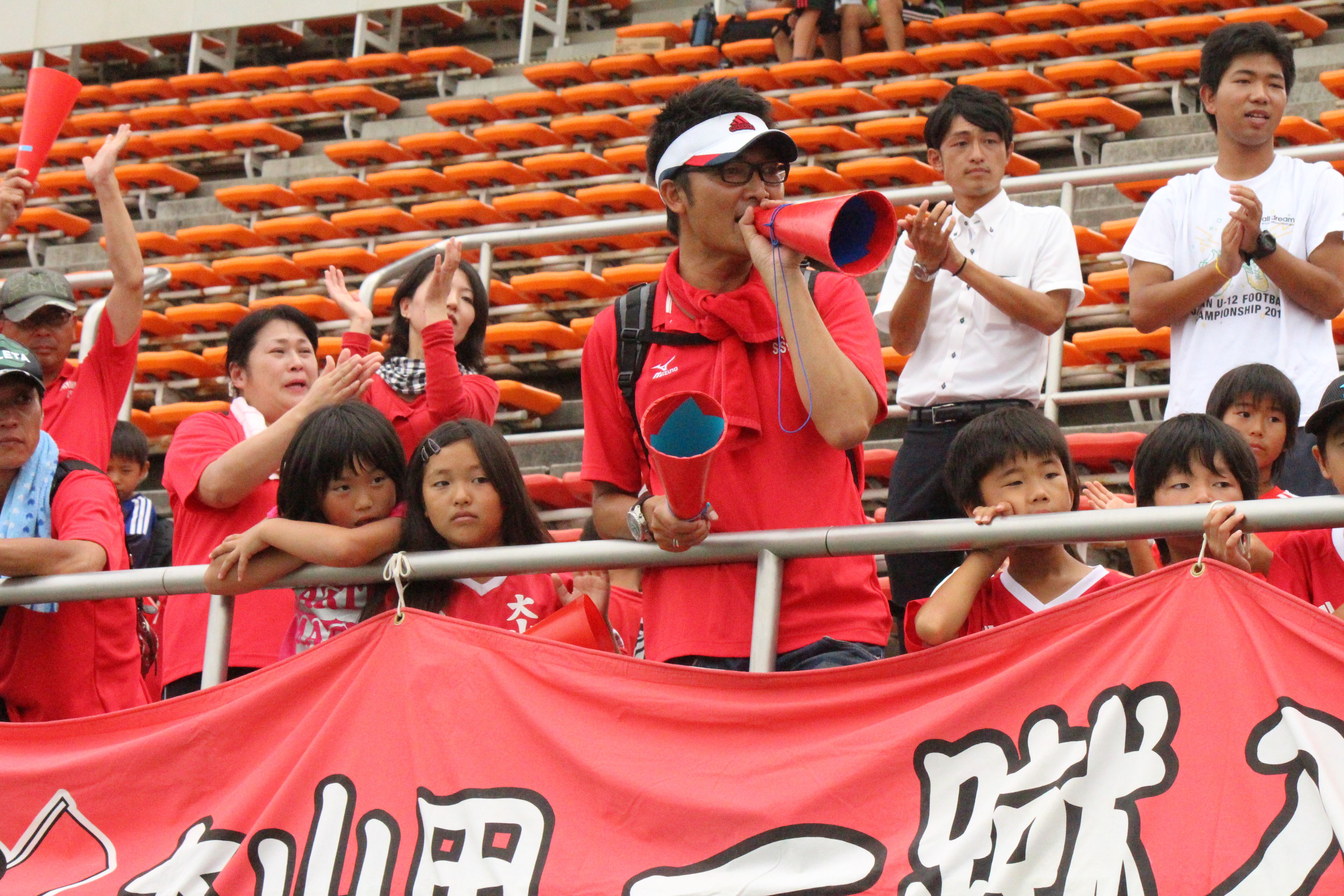大山田SSSの応援を引っ張ったのは、保護者の神津善行さん。隣のピッチまで響き渡るような大きな声で応援をリードしていました。良いプレーの時は大きな賞賛の声を挙げ、ピンチの時には励ましの声を懸命に送っていました。準決勝は序盤から失点を重ねる苦しい展開でしたが、「楽しんで!」「諦めるな!」と声を挙げ、ハーフタイムでも「まだまだ諦めませんよ!」と神津さんは歌でチームを盛り上げました。残念ながら敗れた後も鹿島とエールを交歓し、選手たちには「三重県に胸を張って帰ろう!」と健闘した選手たちを励ましていました。