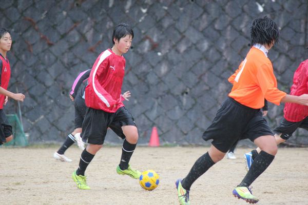 練習メニューも同じです。越智監督は精華女子とともに、男子のU-15チーム、ラランジャ京都の指導に当たっているために、毎日つきっきりで練習を見ることは出来ません。選手たちはリフティングとミニゲームをこなすだけですが、自然と技術が上がる企みを忍ばせているのです。例えば、大きさは3号球ですが、重さは5号球という特殊なボールを使うことで、試合になると、「重さは同じでも、普段よりボールが大きいので、ミートしやすい」(越智監督)感覚を作ってあげる。ミニゲームではビブスを用意せずに、それぞれの練習着で行う。様々な色が飛び交い、誰が味方か敵か分からない状態に慣れさすことで、見る力を養うとともに、「試合になれば2色しかないから、分かりやすい」(越智監督)感覚を作っています。選手たちには、これらの意図は詳しく説明していませんが、数か月、数年先の目標に向けて、大事な感覚を身に付けさせるための企みとして練習を行っているのです。