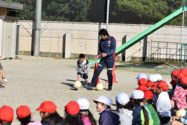 「やはりベースは“楽しい”こと。楽しい環境が作れるか。たとえば、今日、最後にドリブル競争をしましたが、あれはスタートの位置と、よーいどんのタイミングを自分たちで決められる設定にしました。それがミソです。競争する二人で話し合って決めていきます。このメニューをおもしろく感じるかどうか。楽しめるかどうか」