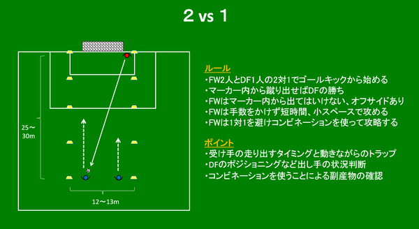 最初のトレーニングは「2対1」。攻撃2人、守備1人の状況で、守備の選手が前方にいる攻撃の選手へ強いパスを出し、プレーがスタートする。ゴールエリア幅にマーカーを設置し、守備側はマーカー内からボールを外に出せば勝ちとなる。攻撃側はマーカー内から出てはいけないルールでゴールを目指し、オフサイドもある。
