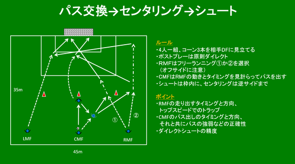 2つ目のトレーニングは「パス交換→センタリングシュート」。ゴール前の設定で、4人1組でプレー。コーンをDFに見立て、走り込む味方にパスを合わせるトレーニングだ。