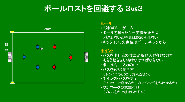 3つ目のトレーニングは「ボールロストを回避する3対3」。20m×15mのグリッドで、3対3のミニゲームを実施。「ボールを奪ったら、横か後ろにパスをする。それをしないと得点が入ったとしても認められない」というルールにすることで、奪ったボールをすぐに相手に奪われないように意識づけしていく。
