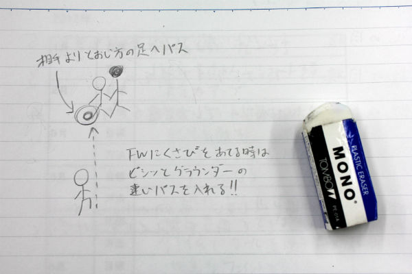 プレーについて書くときは「逆サイドへ“ふわっと”したクロスを入れる」や「DFの間を“バシッと”強く、速いパスを通す」など、擬音を積極的に使いましょう。そうすることで、プレーのイメージがしやすくなります。