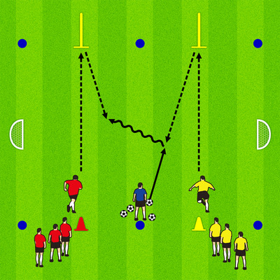 【ルール】2人1組で競い合う1対1。それぞれが手にマーカーを持ち、コーチの合図でダッシュをスタート。向こう側にあるライン上にマーカーを置いたらすばやくターン。コーチ役はターンをして早く振り向いて近づいてきた選手に向けてボールを供給し、そこから1対1がスタートする。