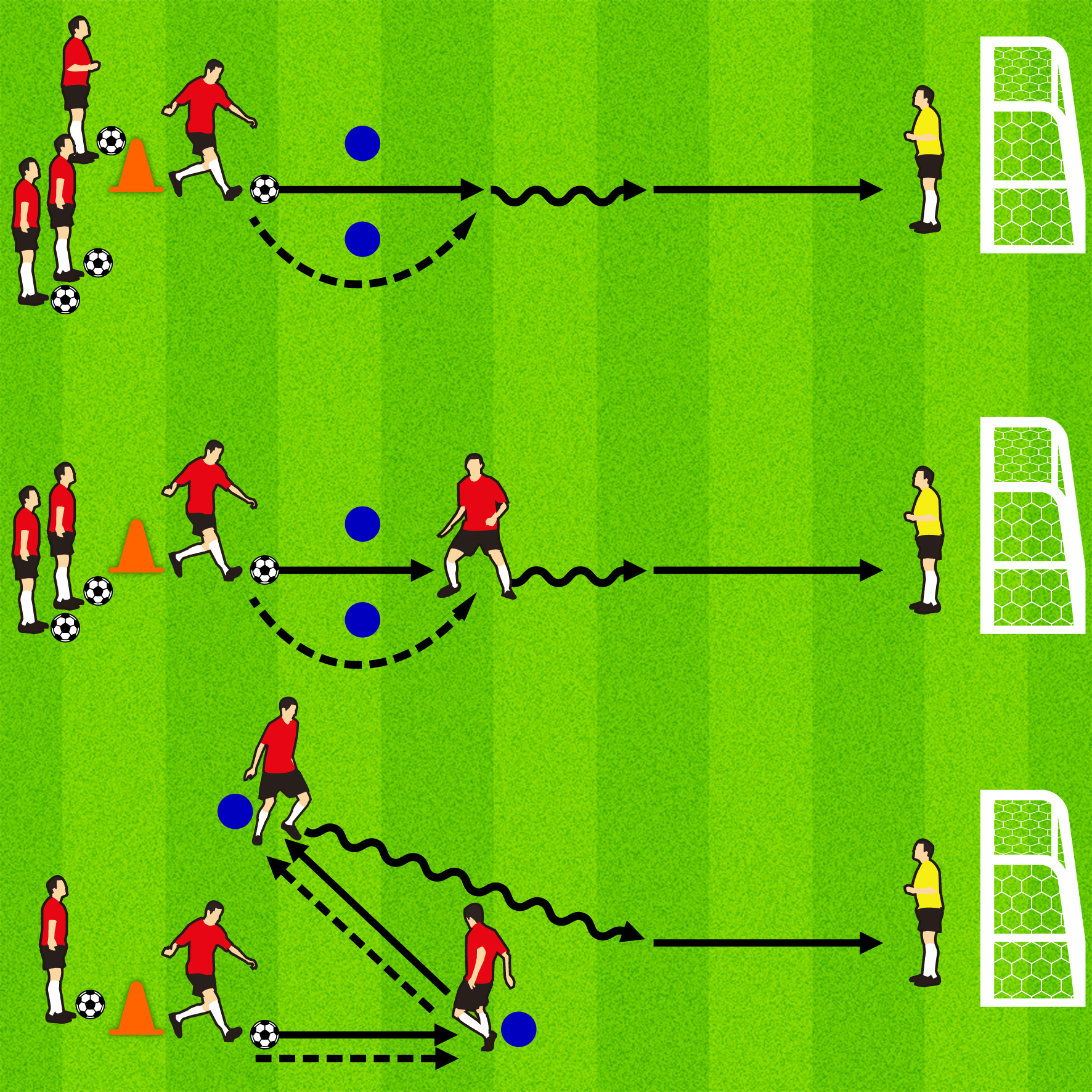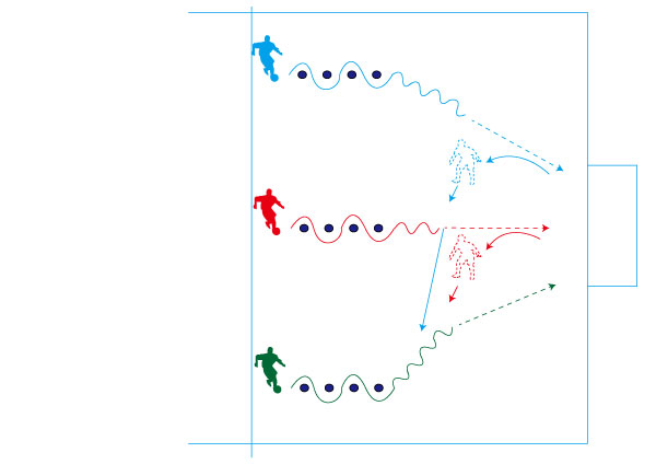 【ルール】図のようにコーンドリブルを開始するポイントを3つ用意する。ドリブルを開始する3選手はそれぞれ時間差をつくってスタート。最初にシュートを打った選手は、隣のレーンの選手のドリブルやシュートに対して守備をスタート。さらにその選手もシュートを打って攻撃が終了した瞬間に守備をスタートし、シュートを放った2人が、3人目のシュートを阻止すべく素早く切り替えて守備をする。