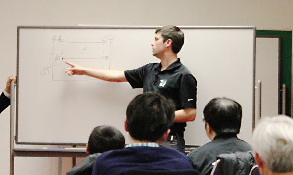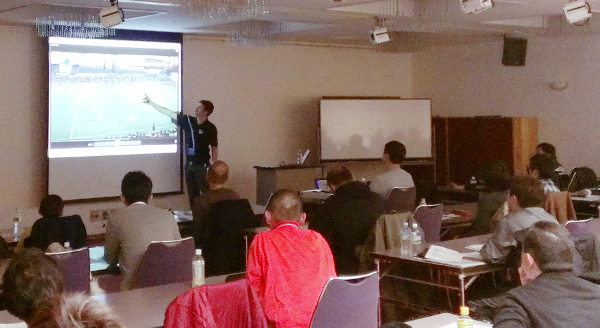 講習会では、どのようなトレーニングを通じて、これらのコンセプトを身につけるかという説明がありました。トレーニングメニューは『知のサッカー第2巻』に収録されているので、詳細はそちらをご覧頂くとして、ポールコーチはトレーニングを組み立てるときのポイントについて、参加者のみなさんにアドバイスをしていました。