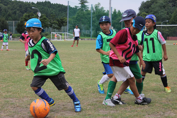 そして、子どもたちの積極的なこと。コーチから「誰か手伝って」とデモンストレーションの相手を頼まれるとほとんどの子が立候補します。質問にもはきはき応え、失敗を恐れずに取り組む様子は見ていてとても気持ちがいいものでした。また、試合形式の練習では大きな声で指示を出したり、ゴールを決めてチームみんなで喜んだり。つい数時間前に初めて会ったとは思えない仲の良さを見せてくれました。
