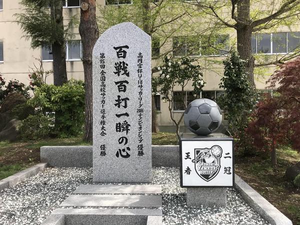 (青森山田高校の学び舎と2016年の2冠を称えた石碑)