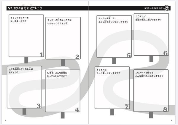 たとえば、1ページ目の質問は「なりたい自分に近づこう」というテーマで「どうしてサッカーをはじめましたか?」「サッカーの好きなところはどんなところですか?」「いつも応援してくれる人は誰ですか?」など、「自分を知る」ことから入っていきます。