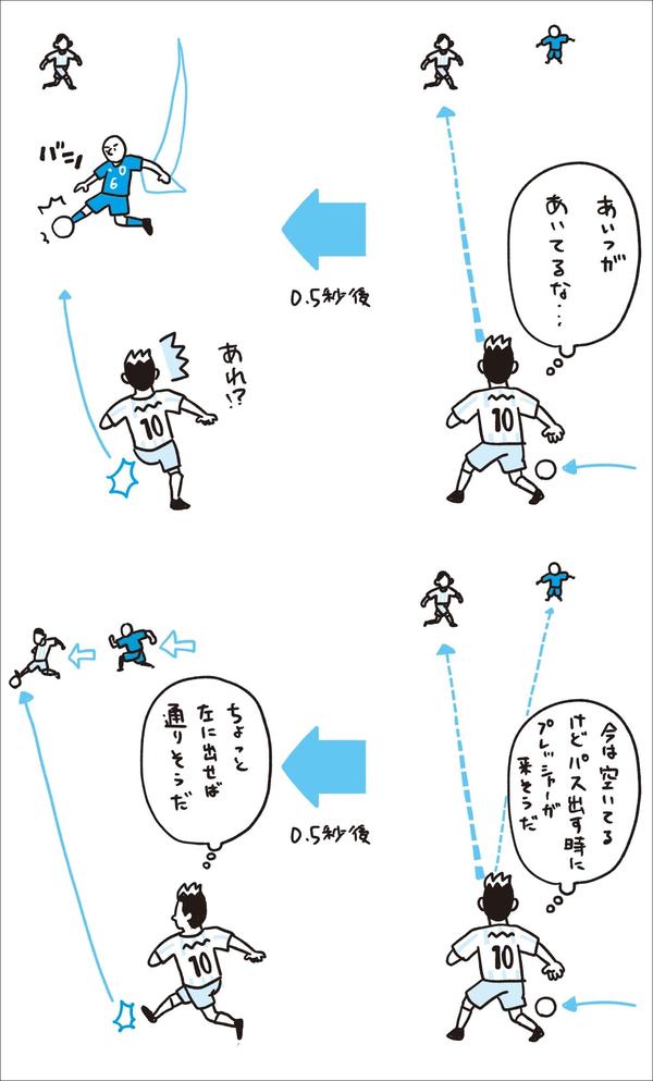 サッカーでは、0・5秒も経たないうちに目まぐるしく状況が変わり得ます。今自分が見た景色は、実際に自分がプレーする時にはまったく違うものになっている可能性が高いです。「今」覗いた景色の中で、味方や相手の配置、スペースの有無、ボールが動くスピード、どちらがリードしているかなど試合の状況......さまざまな要素を踏まえて、少し先の「未来」を覗く必要があります。これを「『今』の形から『未来』を見る」行為と呼んでいます。