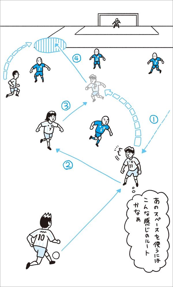 必要なのは、自分の立ちどころからピッチ上の景色を覗いた時、少し先の未来の状況も合わせて覗くことです。イラストでイメージすると左ページ下のようになります。