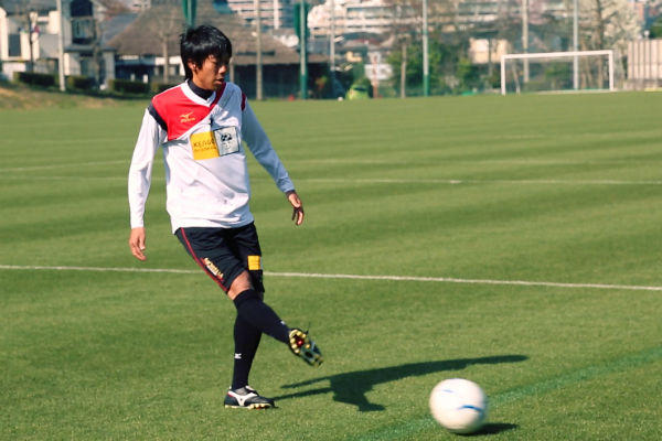 キックについて、僕が心掛けているのは、相手に読まれないように、できるだけコンパクトな振りで蹴ること。ボールを蹴るときは、勢いをつけるために足を後ろに振り上げる「テイクバック」と呼ばれる動作が入ります。