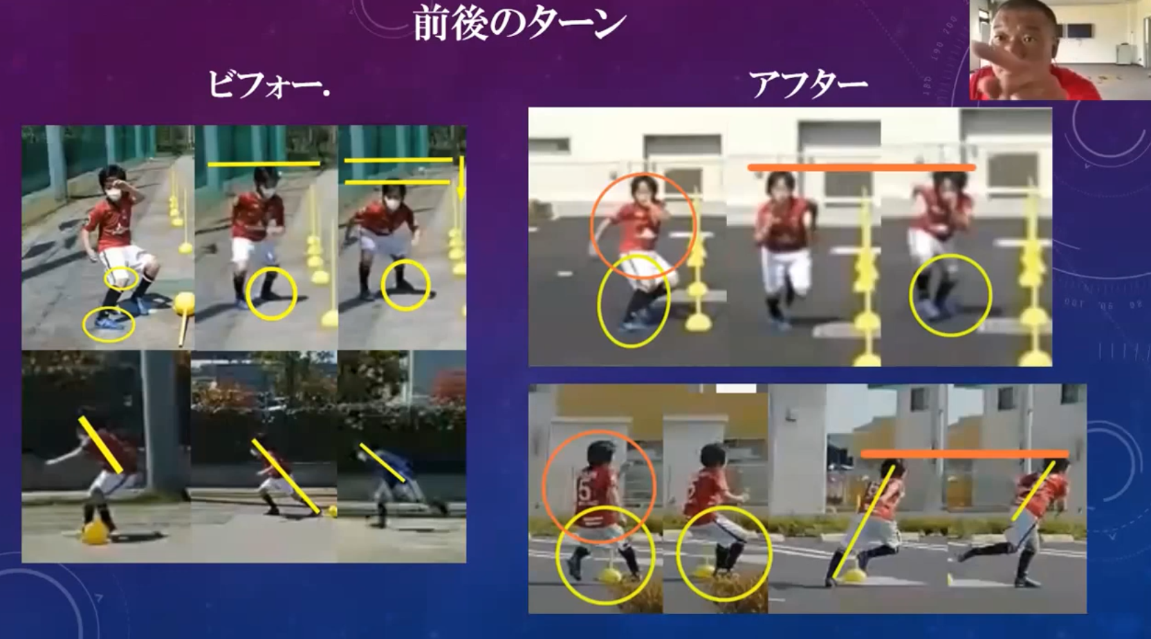「走るスピード」と「ターンの技術」は別物。速く走れる能力を持っているので、ターンもトレーニングすることによって素早くなります。「素早いターン」と「ターンの後の身体の使い方」を覚えることで、1対1で簡単に抜かれなくなるだけでなく、相手からボールを奪えるようになってきます。