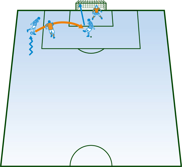 ペナルティーエリアの横でボールをもったときに、クロスボールのアイデアの一つとして使えるキックだ。軸足を踏み込むタイミングを悟られずに変則的にボールを蹴れるので、相手を驚かせてリズムを狂わすことができる。密集したエリア内でのとっさのプレーにも有効だ。