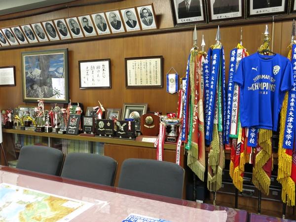 校長室に飾られた優勝旗とトロフィー。これからは教師も24時間をデザインする必要があると平岡氏は言います。