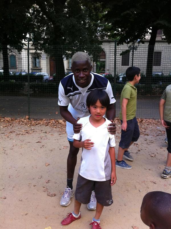 散歩の途中でダゼーリオ広場に立ち寄った元セネガル代表FWパパ・ワイゴ(当時フィオレンティーナ所属)。さすがのテクニックで子どもたちの目を釘付けにしていた。