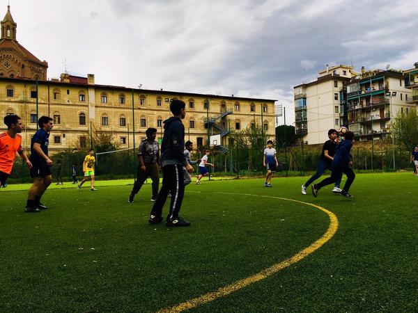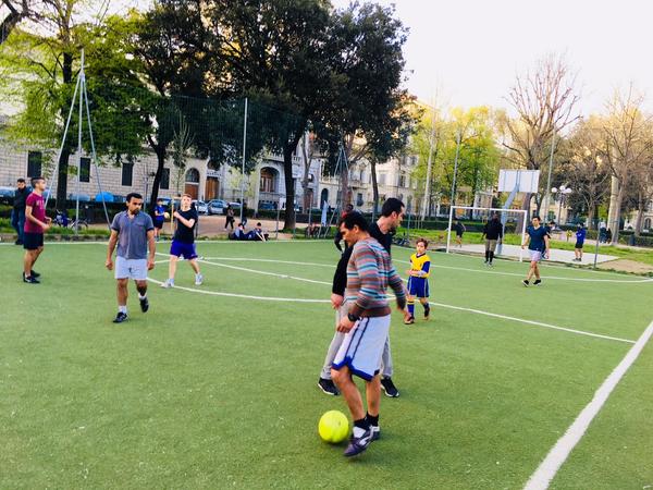 ダゼーリオ広場に集まる人々は、年齢はもちろん国籍もまたバラエティに富んでいます。地元のイタリア人はもちろん、日本人(つまり息子)、ブラジル人、スペイン人、アルバニア人、それにアフリカや東南アジア各国の人々など。気がつけば本気モードのゲームが始まります。