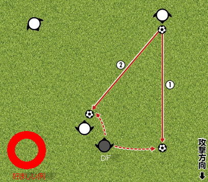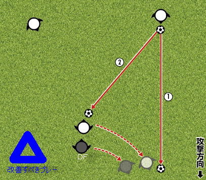 次の選択肢が②の足元へのパスですが、パスが出たタイミングで動き出せば、インターセプトを狙えます。