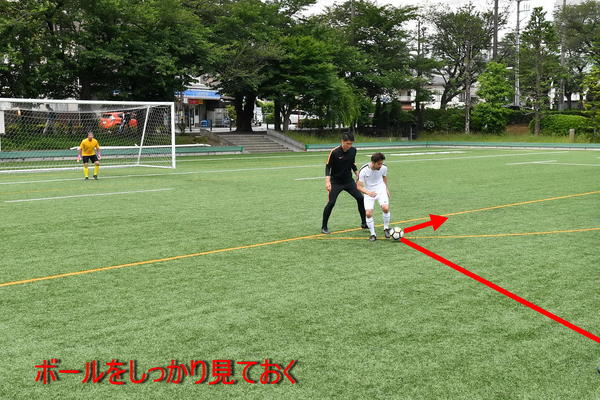 そのためゴール前では相手とゴールの間にポジションを取ることが重要です。こうすれば、相手の足元にボールが入ってターンを許したとしても、素早く対応でき、シュートをブロックできるからです。