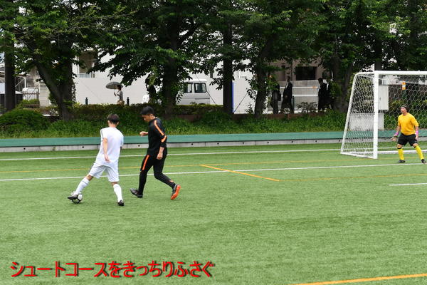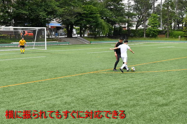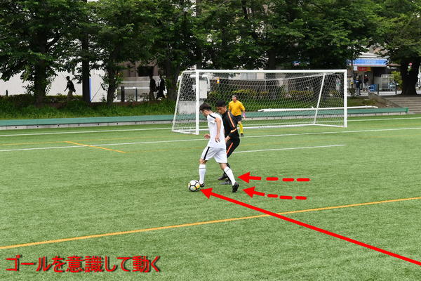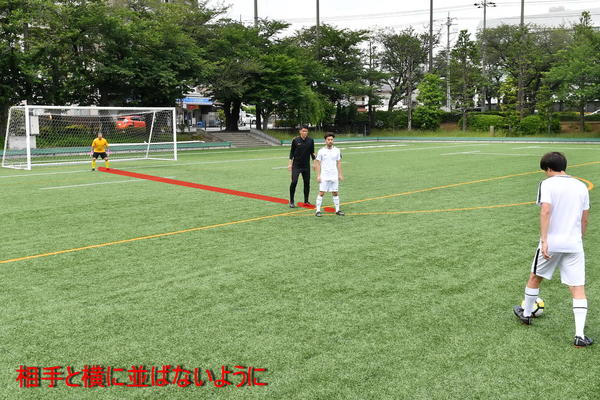 中盤のエリアでは、縦パスを入れられないようにボールがあるサイド側に立ちましたが、ゴール前では相手とゴールの間に立つので、縦パスを入れられやすくなります。しかしゴール前では裏のスペースが狭いので、縦パスが出て相手にレシーブされても、すぐに追いつくことができ、シュートコースを消しながら対応できるのです。