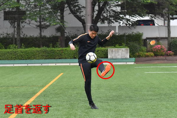 2.インサイドで面を作ってミートし足首を内側へ返す