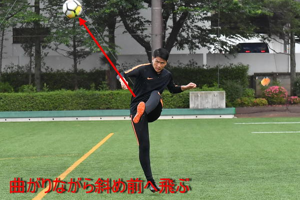 クリアボールを蹴り出す方向は斜め前が理想的なので、蹴る瞬間に足首を返せば、ボールにカーブがかかり、斜め前にクリアすることができるのです。