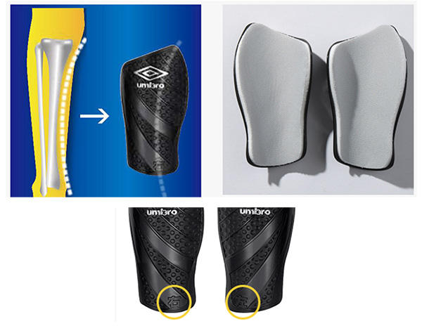 アンブロのジュニア用すねあては、子どものすねの骨を考えて作られた3D設計で、プレー中でもずれにくくなっています。 左右で形が違いますが、前面に「右」「左」の文字が印字されているので、間違うことはありません。