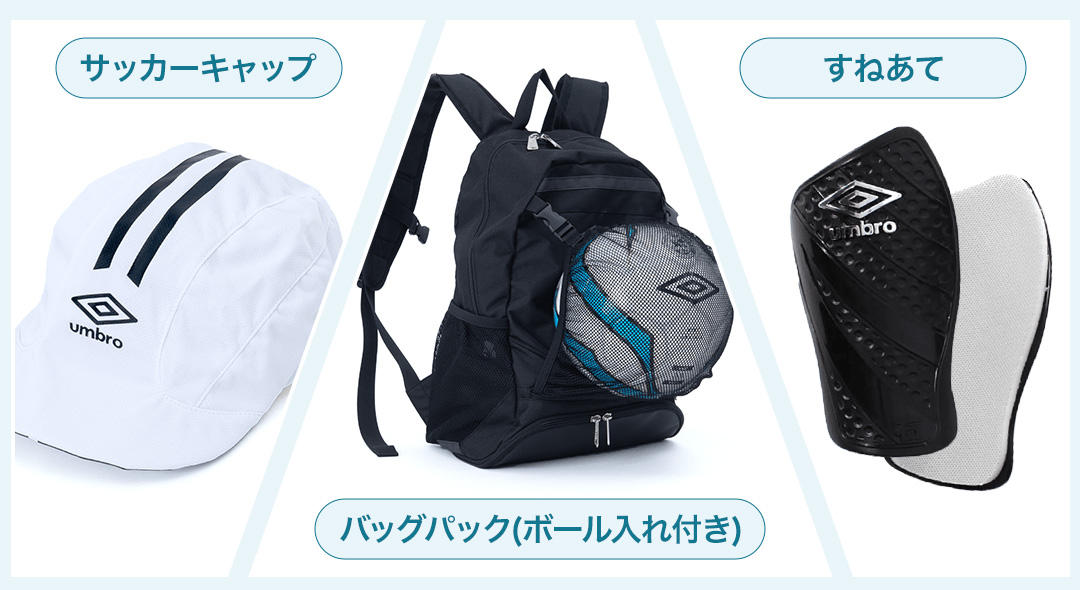 サカイクで実施した『サッカー用具に関するアンケート』から、選ぶのに悩んだという声が多かった「バッグパック」「キャップ」「すねあて」の3点をセットに。老舗ブランド「アンブロ(umbro)」と共同開発し、子どもにとって使い勝手がいいのはもちろんのこと、デザインもこだわりました。