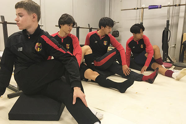 選手たちに行ってもらったのは、どのチームでも行っている股関節・腸腰筋のストレッチ。