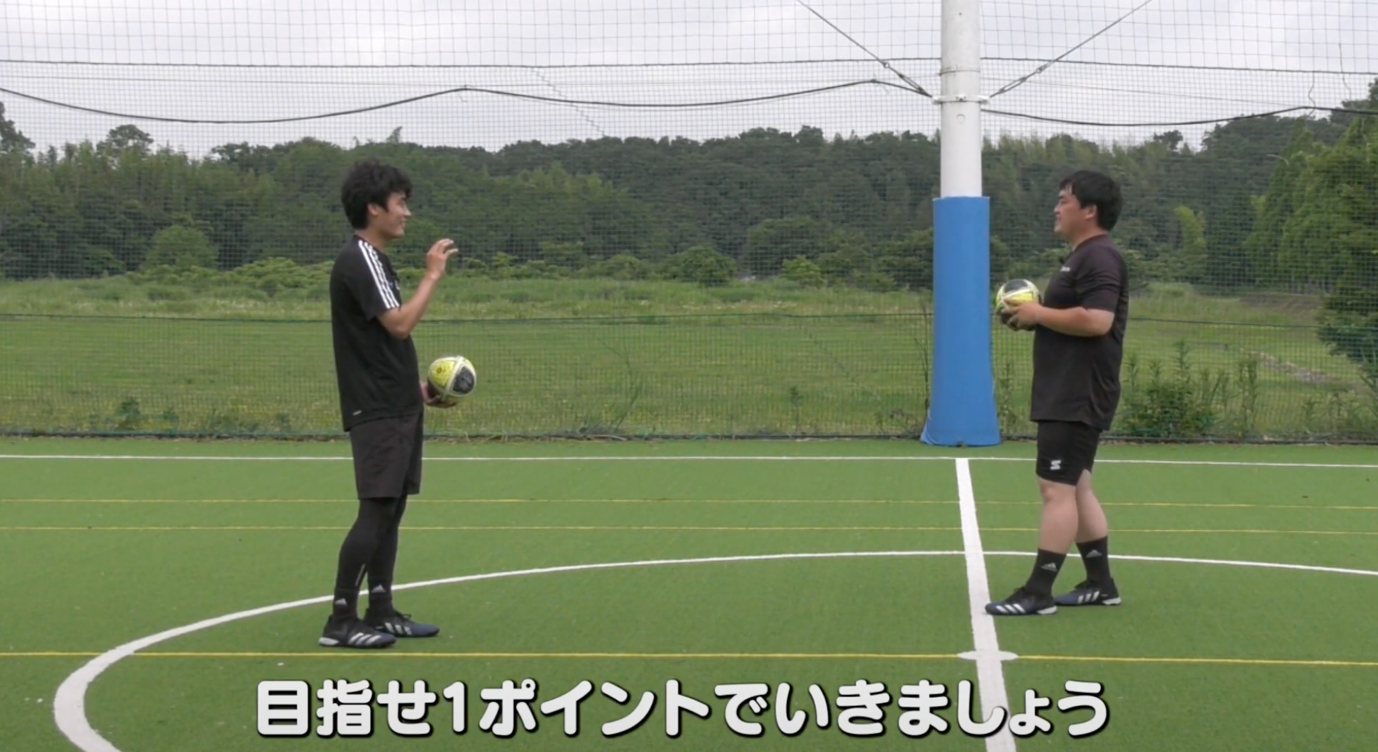 ルールはとても簡単。テクダマでリフティングをしながらもう1人が投げるテクダマを手でキャッチして返すというものです。リフティングをしている人がボールを返せたら1ポイントとなります。