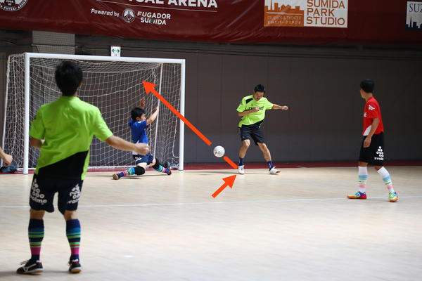 フットサルにはオフサイドがないので、あらかじめセグンドで待っていても大丈夫。大切なのは、マークしてくる相手に気づかれないように背後へ回ってシュートすることです。