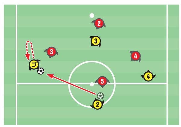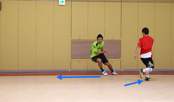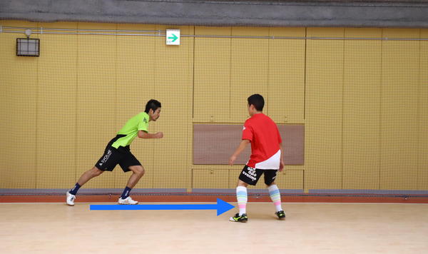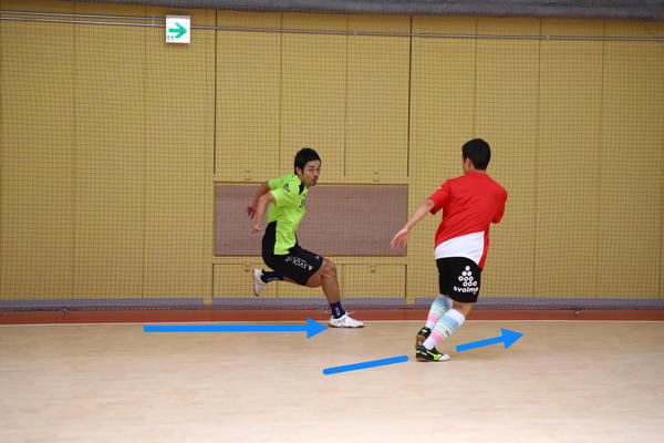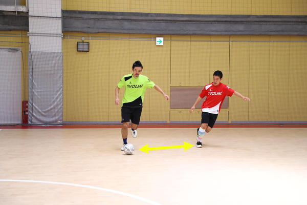 サイド前方で味方からのパスを受けるときに困るのが、相手が近くでマークしているケースです。そんなときは相手の裏へ抜けようとする動きから急ターンで元いた場所に戻ってくる、「フェイク」の動きを使います。