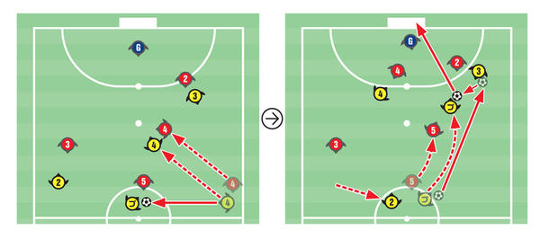 最前線に入ってシュートやポストプレーをする選手をピヴォといいますが、中盤エリアでは特にこのピヴォをうまく使って攻めることが大切です。周りとのコンビネーションがポイントになってくるので、敵味方の状況をよく見てプレーするように心がけてください。