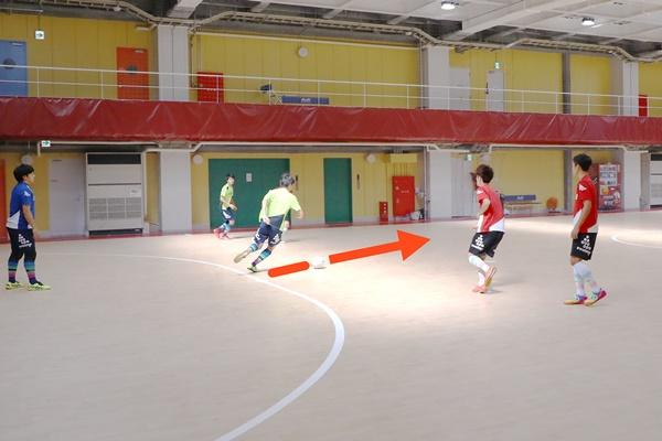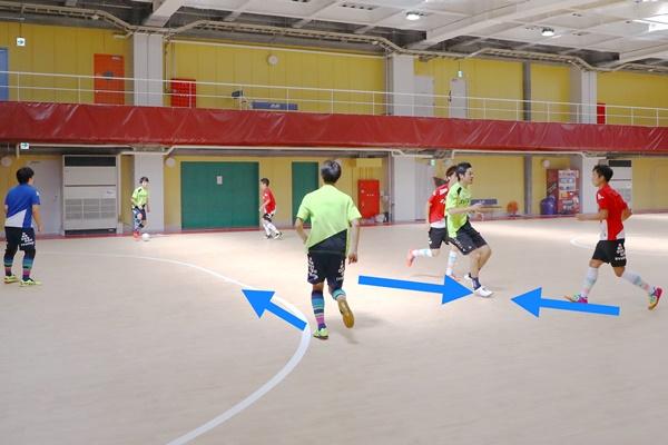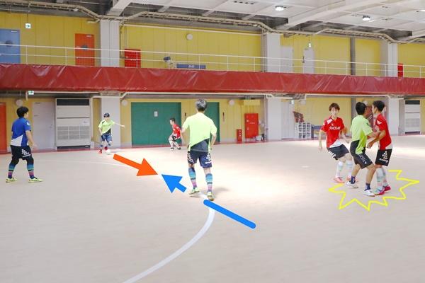 左へパスを出し、右の味方とスイッチするときにマーカーのじゃまをする