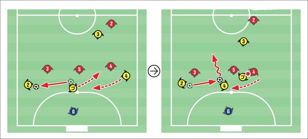 4.フリーの味方がパスを受け、空いている中央から前進します