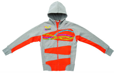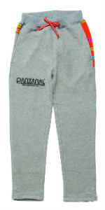 裏面に起毛素材を用いることで高い保温性をキープするスウェットパーカーと、セットアップ用のパンツ。ビビッドなオレンジのボーダー柄がポップでオシャレなスエット。着心地の良さとデザイン性を見事に両立させている。