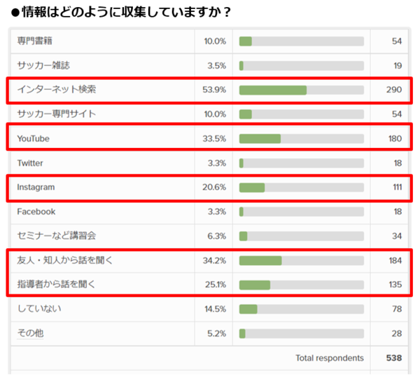 インターネット検索が53.4%と最も多く、つづいてYoutubeが33.5%。Instagramなどネットでの情報収集が中心。また保護者の間や指導者からの情報などリアルなコミュニケーションでも情報共有が行われているようです。