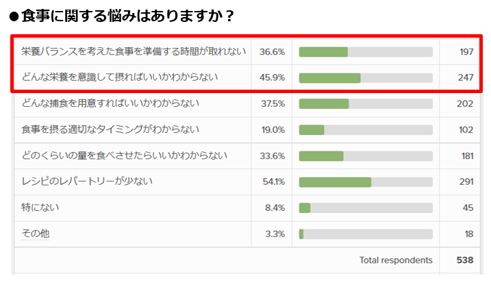 最も多かったのは「レシピのレパートリーが少ない」が54.1%、次に「どんな栄養を意識して摂ればいいかわからない」が45.9%でした。