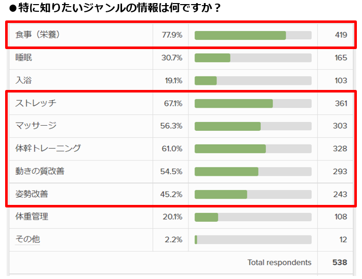 食事(栄養)について具体的に知りたいと回答したのが77.9%と最も多く、また、ストレッチ、マッサージ、体幹トレーニングといった身体のケアや、動きの質、姿勢改善といった情報に対しても高いニーズが見受けられました。