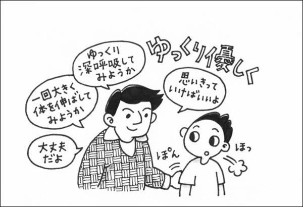 緊張の度合いが高い時は、「ゆっくり大きく息を吐いて、深呼吸してみようか」「一回、大きく体を伸ばしてみようか」とリラックス効果を得られる行動を直接的にうながします。その時もゆっくりと、優しい口調で諭すように、時には背中をさすったりして、身体的感覚に働きかけていく。泣きじゃくる子どもをなだめるようなイメージです。