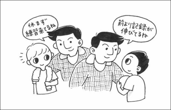 「頑張っているね」「休まず練習にきているね」「先週より上手く出来るようになったね」「前よりも記録が伸びているね」
