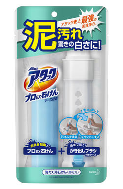 「アタック プロEX石けん」は、アタック史上最強(*ブラシ使用での比較 2017年花王調べ)の泥洗浄力を備えた部分用洗たく石けんです。泥高分散剤配合で、繊維の奥の頑固な汚れまで落としてくれます。形状も実用的! ケースに入っているため手が滑らずに石けんを塗り込みやすく、先端についた「かき出しブラシ」は、手もみでは落としにくい繊維の奥の泥汚れまで、楽に落としてくれるのです。