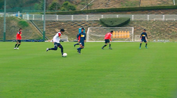 例えば、僕が中盤の左寄りの位置でボールを持っているとします。前線へのパスコースには相手選手が立っています。僕だったら、右足の外側にボールを置いてから、チラッとサイドのスペースを見て、カラダをその方向に向けます。