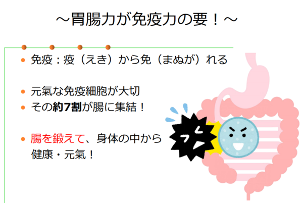 また、胃腸を元気にすることが、免疫力UPにもつながります。私たちを病原菌から守ってくれているのは、免疫細胞です。免疫細胞の約7割が腸に集まっています。つまり、腸が健康できれいな状態でないと、免疫細胞はちゃんと働けません。腸を元気にするためにも、まずはしっかり噛んで内臓を元気にしていきましょう。