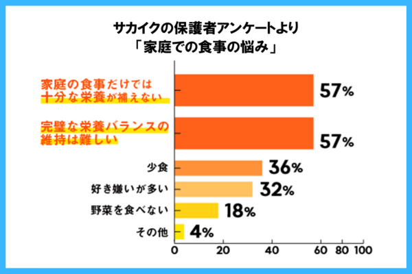 「サカイクで保護者にアンケートをとると、『家の食事だけでは十分な栄養が補えない』『完璧な栄養バランスの維持が難しい』と答えた人が半数以上おり、せっかく頑張って料理を作っても『子どもが少食で食べられない』『好き嫌いが多い』といった悩みがあることがわかりました」