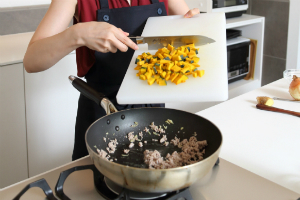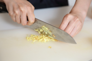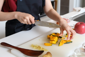1.しょうがをみじん切りにして、カボチャを細かく切る。細かいほうがご飯になじみやすい。